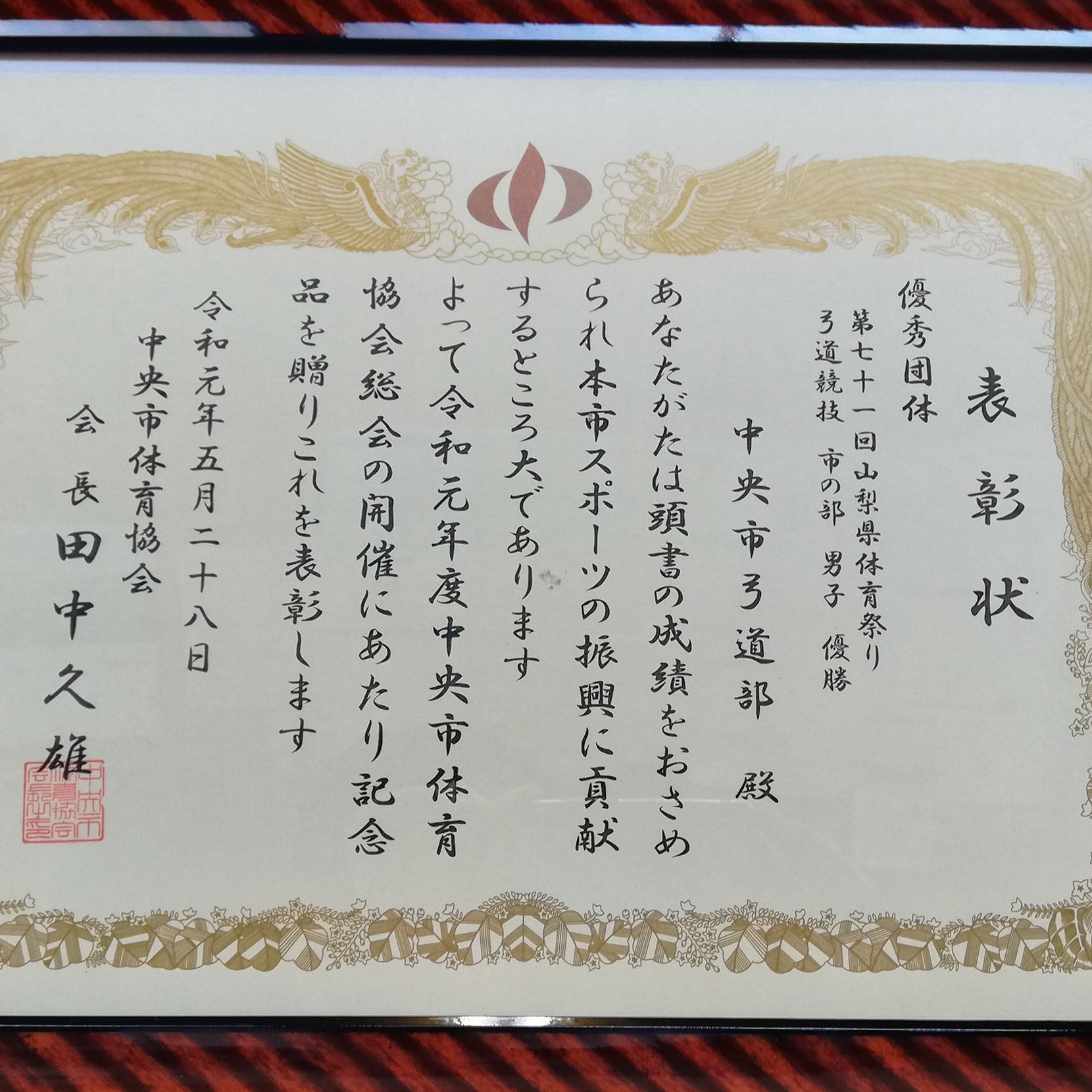 中央市弓道部は、平成30年9月16日の県大会で優勝し、中央市体育協会から賞状を授与されました。